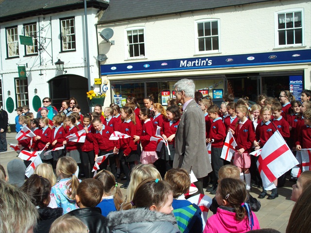 Mayor Cllr. Robin Pegg was present to speak to the large crowd, thanking them for their attendance and introducing the pupils, to brave St. George and the evil Dragon. We heard some beautiful singing and fervent applause rained down upon the choir!